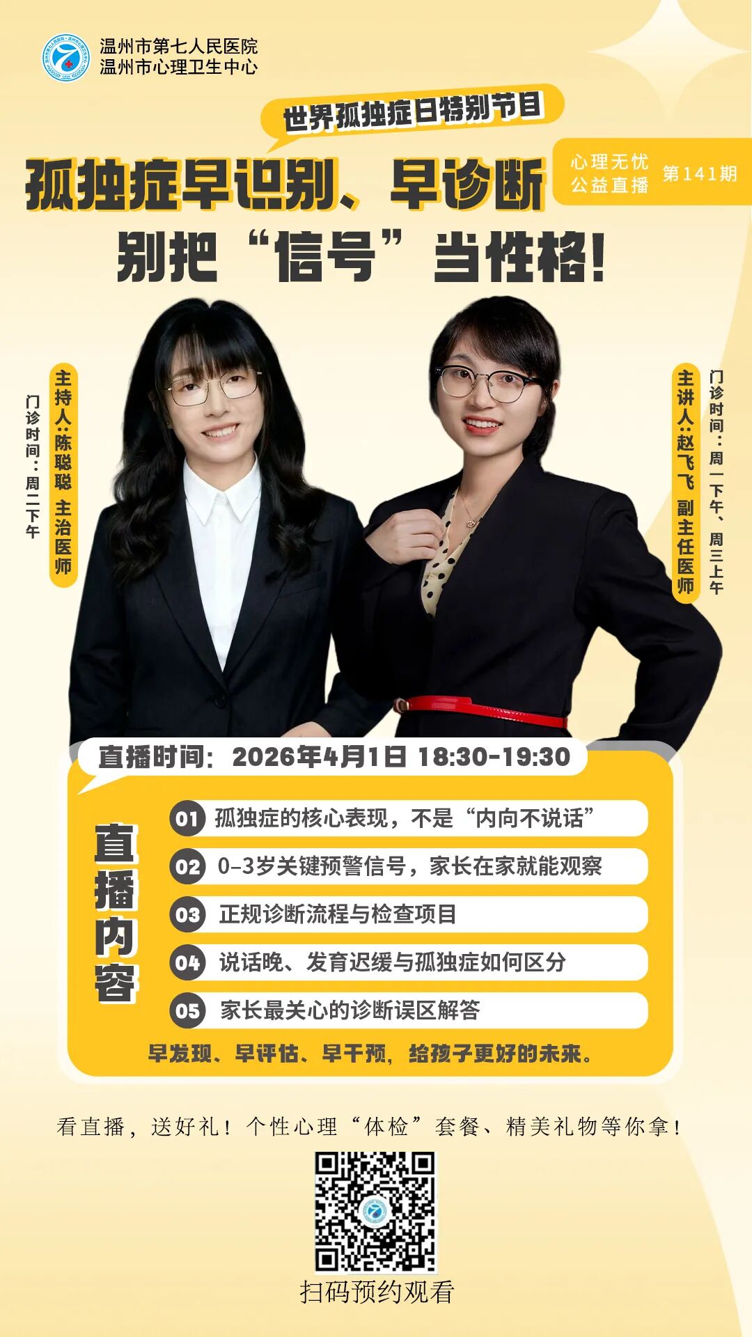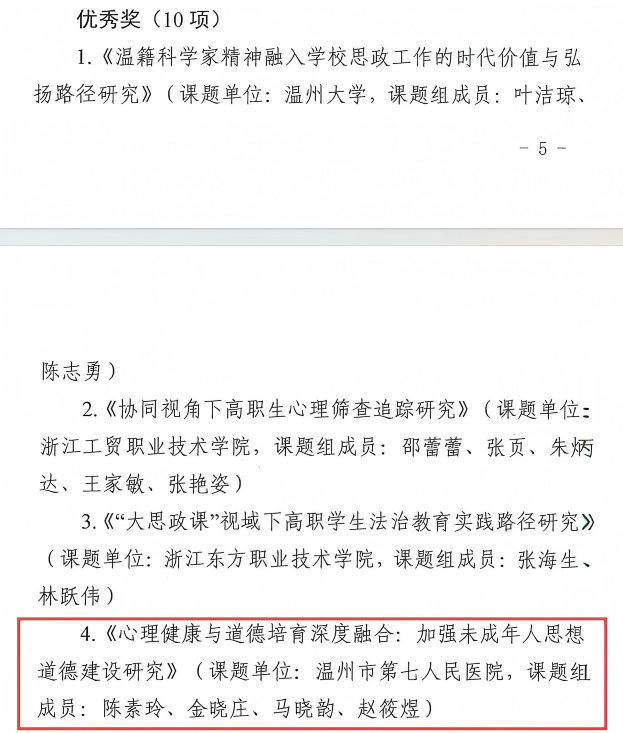 本院儿童精神科是温州市青少年诊治中心之一。科室创建于2018年,系院级医学重点学科(儿少心理科),2016年荣获“市青年文明号”称号,2017年获得“温州市巾帼文明岗”称号。2019年获“温州市青少年诊疗中心”,是温州医科大学医师培训实习基地。温州大学心理系教学科室。2023年2月正式命名为儿童精神科。
