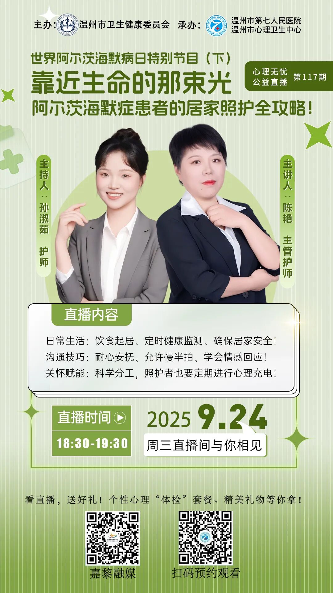 老年精神科(801病区)成立于2006年,是温州市老年重点学科群之一。科室整合“药物-心理-康复-护理”为一体,在药物治疗的基础上,配合神经肌肉电刺激治疗、认知行为治疗、日常生活能力训练、作业治疗、运动治疗、心理治疗等多种治疗手段,使老年人患者得到“身-心-灵”全面照护。