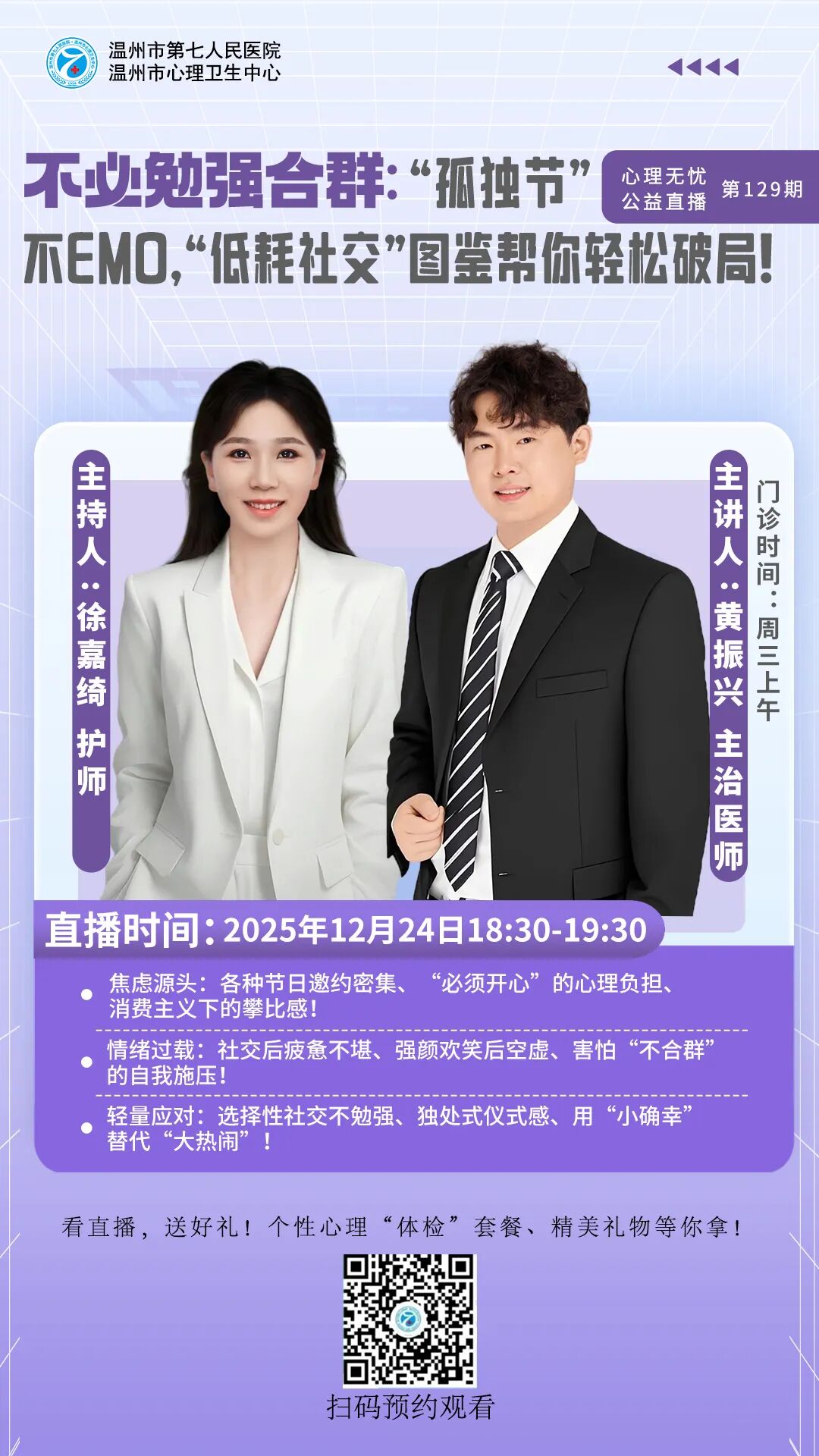 情感障碍科于2015年成立并成为医院院级重点学科,科室发展较快,为了满足患者需要,2020年元月分为501病区和502病区。是温州医科大学、济宁医学院等协作院校医学生的临床实习教学的主要科室,是我院国家医师规范化培训的主要科室 ,是集医疗、科研、教学于一体的综合科室。