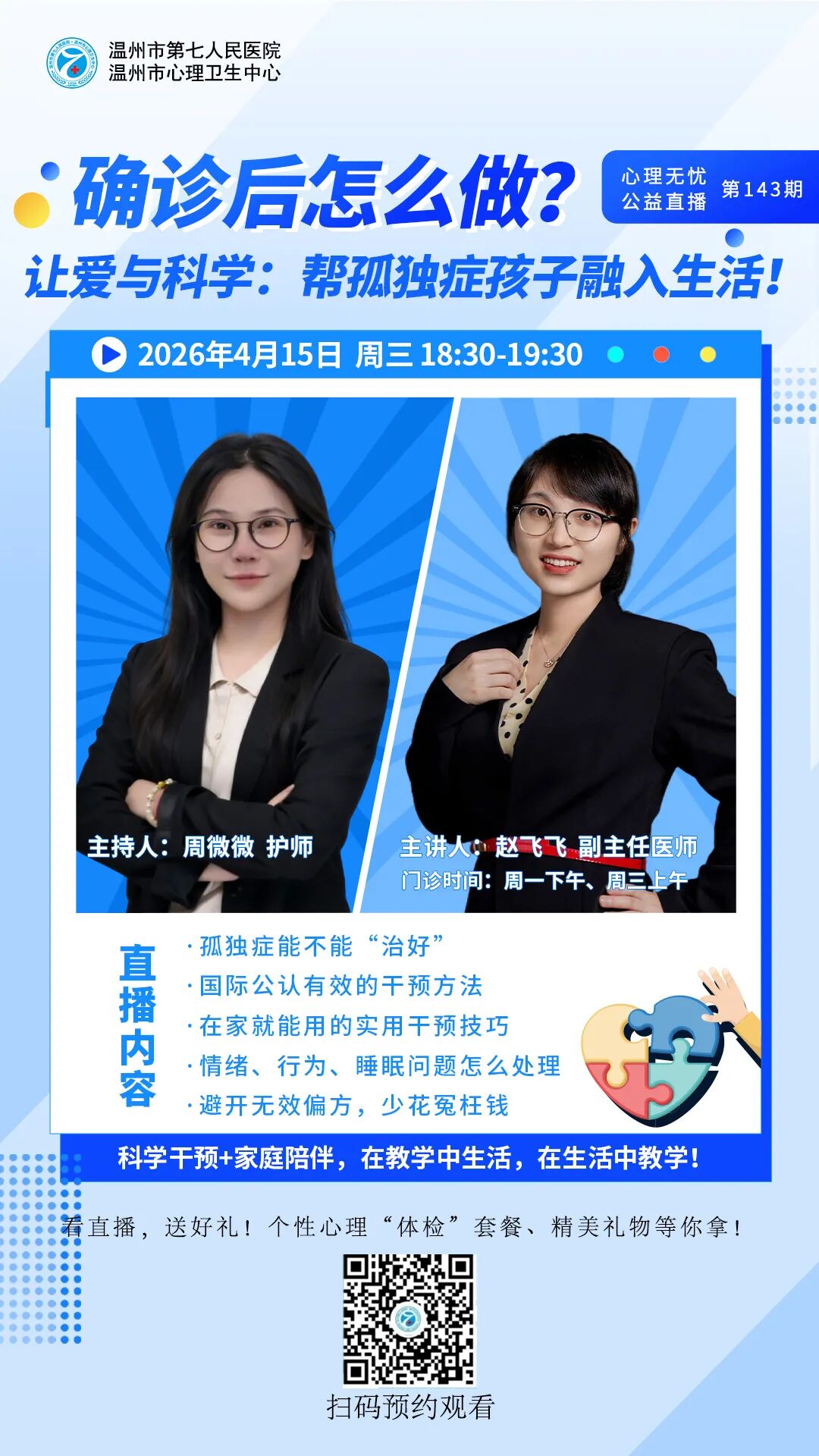 本院儿童精神科是温州市青少年诊治中心之一。科室创建于2018年,系院级医学重点学科(儿少心理科),2016年荣获“市青年文明号”称号,2017年获得“温州市巾帼文明岗”称号。2019年获“温州市青少年诊疗中心”,是温州医科大学医师培训实习基地。温州大学心理系教学科室。2023年2月正式命名为儿童精神科。