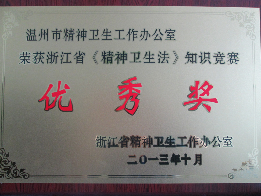 2013年10月,经浙江省精神卫生工作办公室评选,我市精卫办(我院)荣获浙江省《精神卫生法》知识竞赛优秀奖。